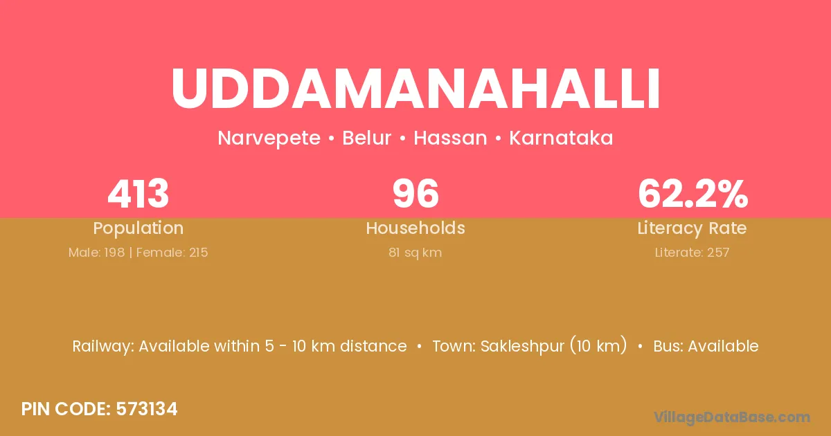 Uddamanahalli village has a total population of 413 people, of which 198 are males and 215 are females.