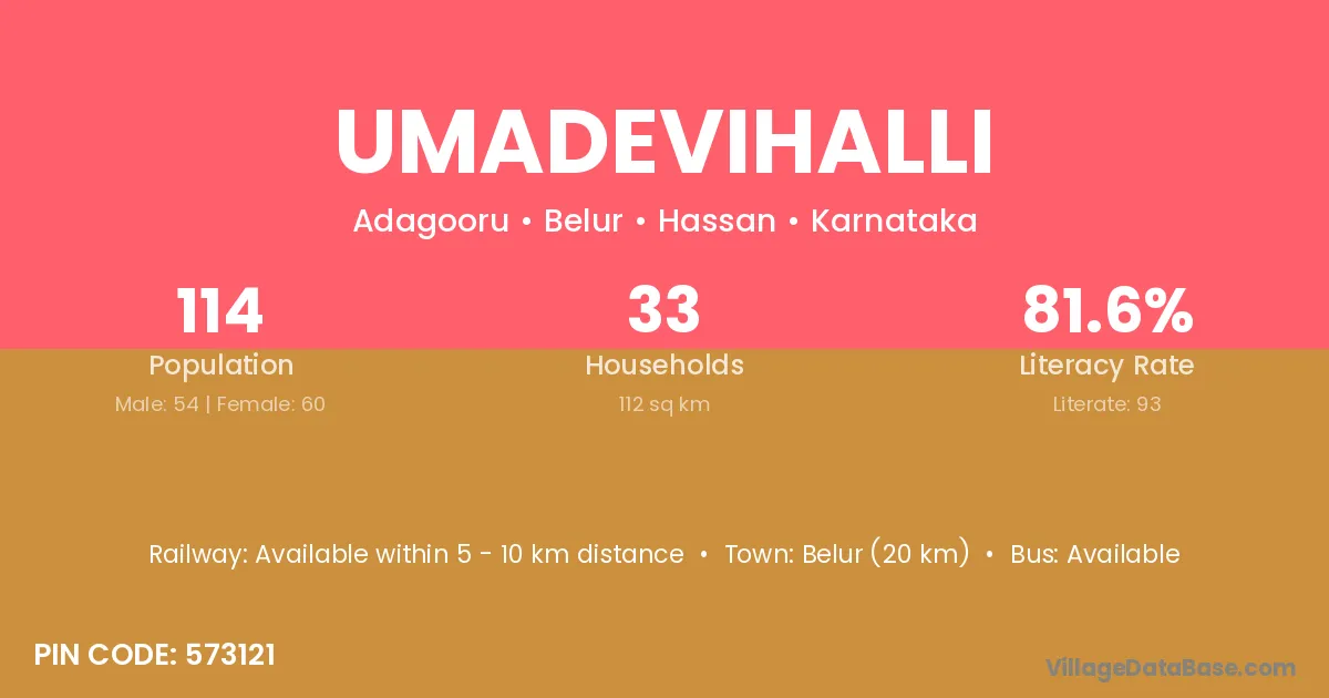 Umadevihalli village has a total population of 114 people, of which 54 are males and 60 are females.