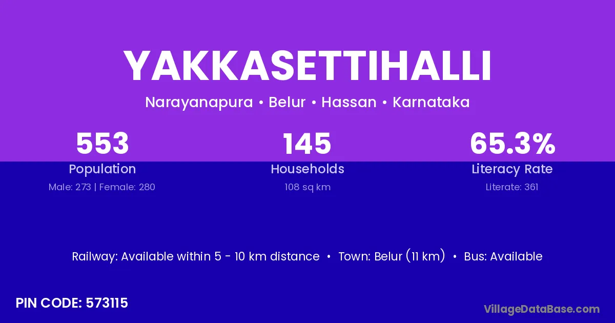 Belur (11 km) is the nearest town to Yakkasettihalli village for major economic activities and is located approximately 11 km away.