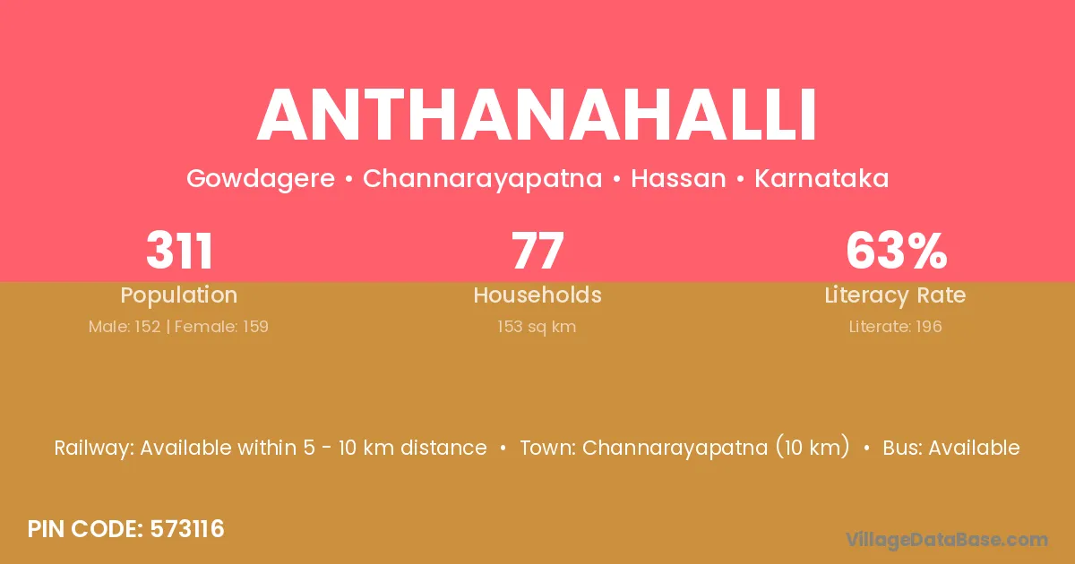 Anthanahalli village has a total population of 311 people, of which 152 are males and 159 are females.