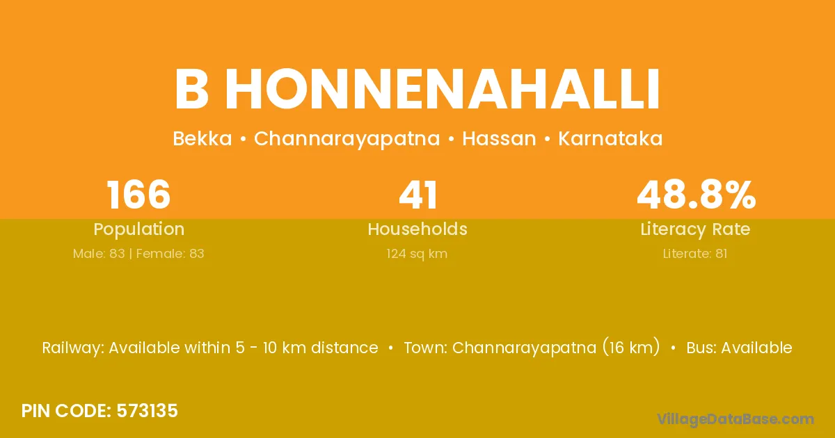 B Honnenahalli village has a total population of 166 people, of which 83 are males and 83 are females.