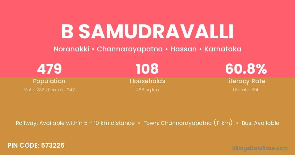 Channarayapatna (11 km) is the nearest town to B Samudravalli village for major economic activities and is located approximately 11 km away.