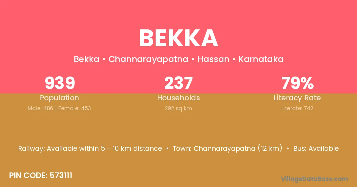 Channarayapatna (12 km) is the nearest town to Bekka village for major economic activities and is located approximately 12 km away.