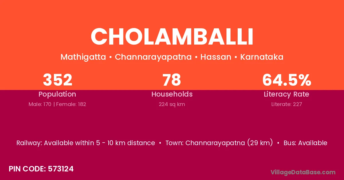 Channarayapatna (29 km) is the nearest town to Cholamballi village for major economic activities and is located approximately 29 km away.