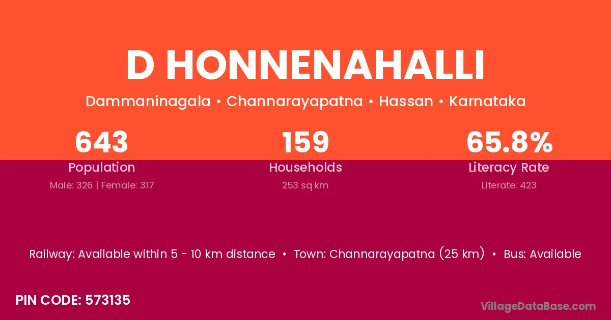 Channarayapatna (25 km) is the nearest town to D Honnenahalli village for major economic activities and is located approximately 25 km away.