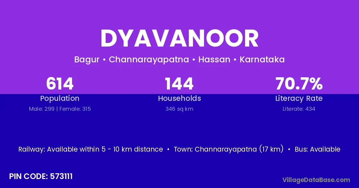 Channarayapatna (17 km) is the nearest town to Dyavanoor village for major economic activities and is located approximately 17 km away.