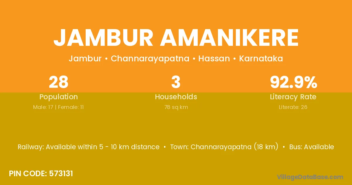 Channarayapatna (18 km) is the nearest town to Jambur Amanikere village for major economic activities and is located approximately 18 km away.