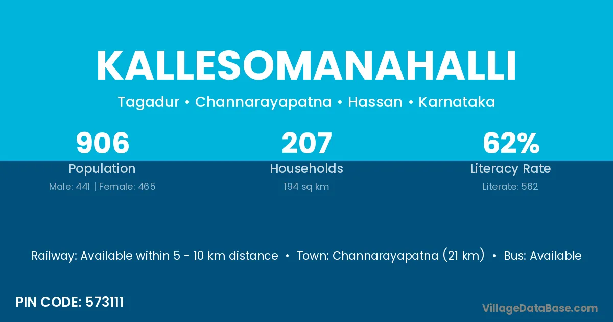 Channarayapatna (21 km) is the nearest town to Kallesomanahalli village for major economic activities and is located approximately 21 km away.