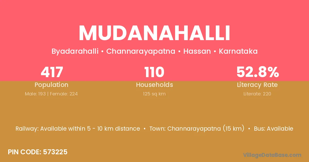 Mudanahalli village has a total population of 417 people, of which 193 are males and 224 are females.