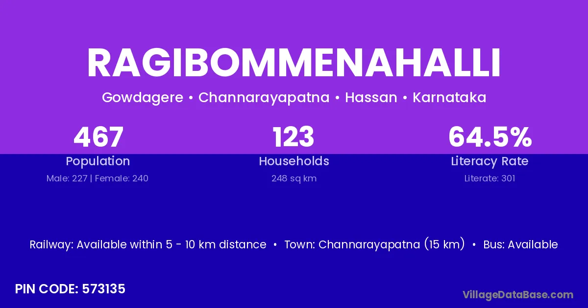 Channarayapatna (15 km) is the nearest town to Ragibommenahalli village for major economic activities and is located approximately 15 km away.