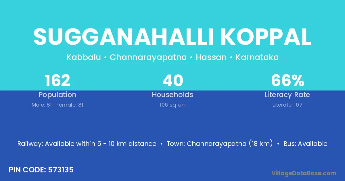 Sugganahalli Koppal village has a total population of 162 people, of which 81 are males and 81 are females.