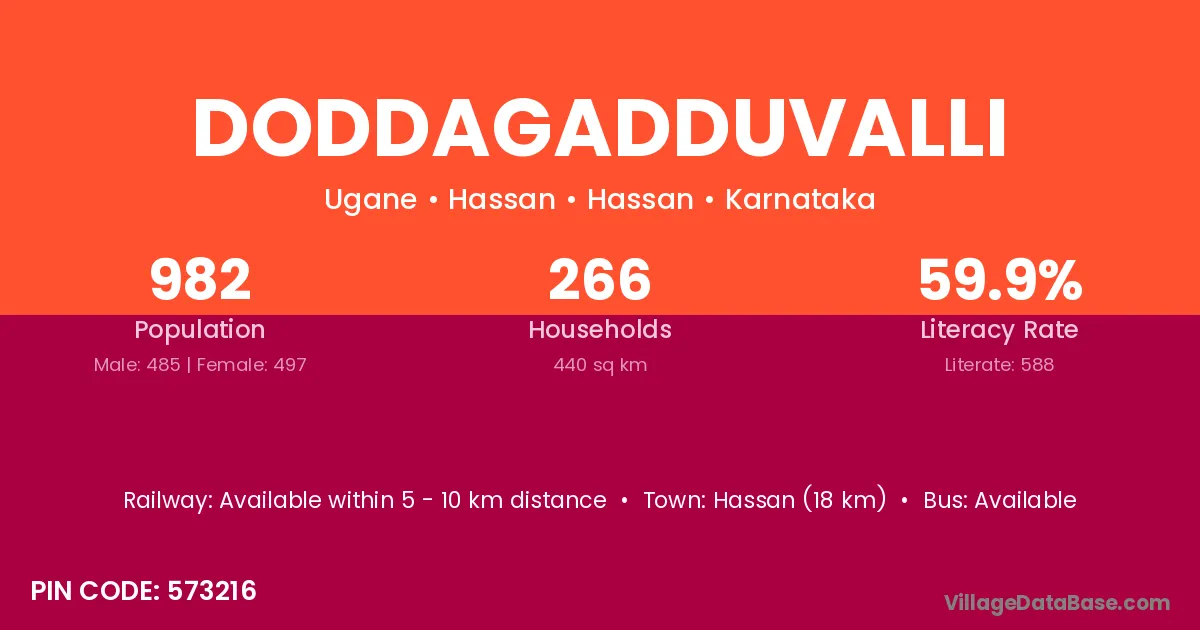 Doddagadduvalli village has a total population of 982 people, of which 485 are males and 497 are females.