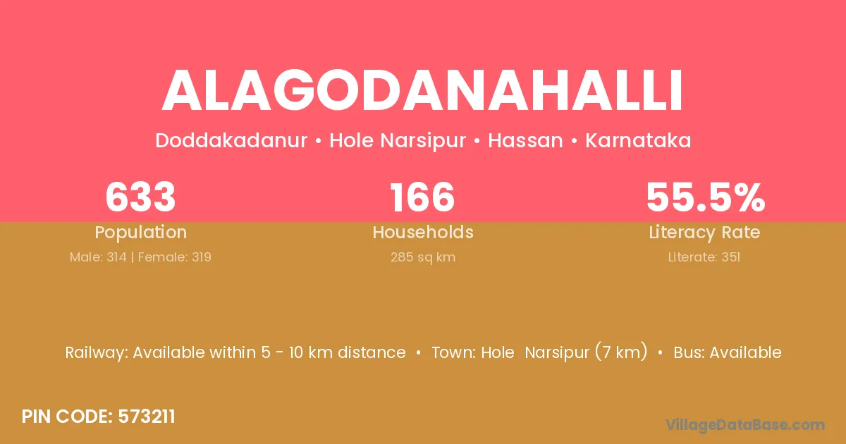Hole Narsipur (7 km) is the nearest town to Alagodanahalli village for major economic activities and is located approximately 7 km away.