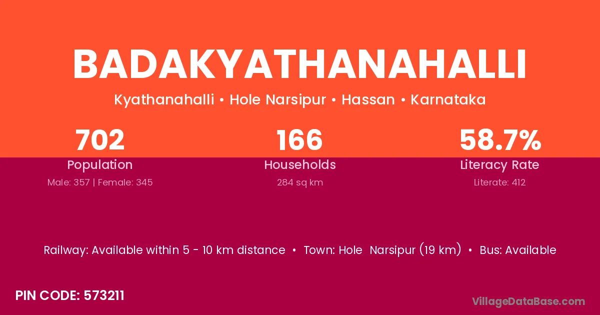 Hole Narsipur (19 km) is the nearest town to Badakyathanahalli village for major economic activities and is located approximately 19 km away.