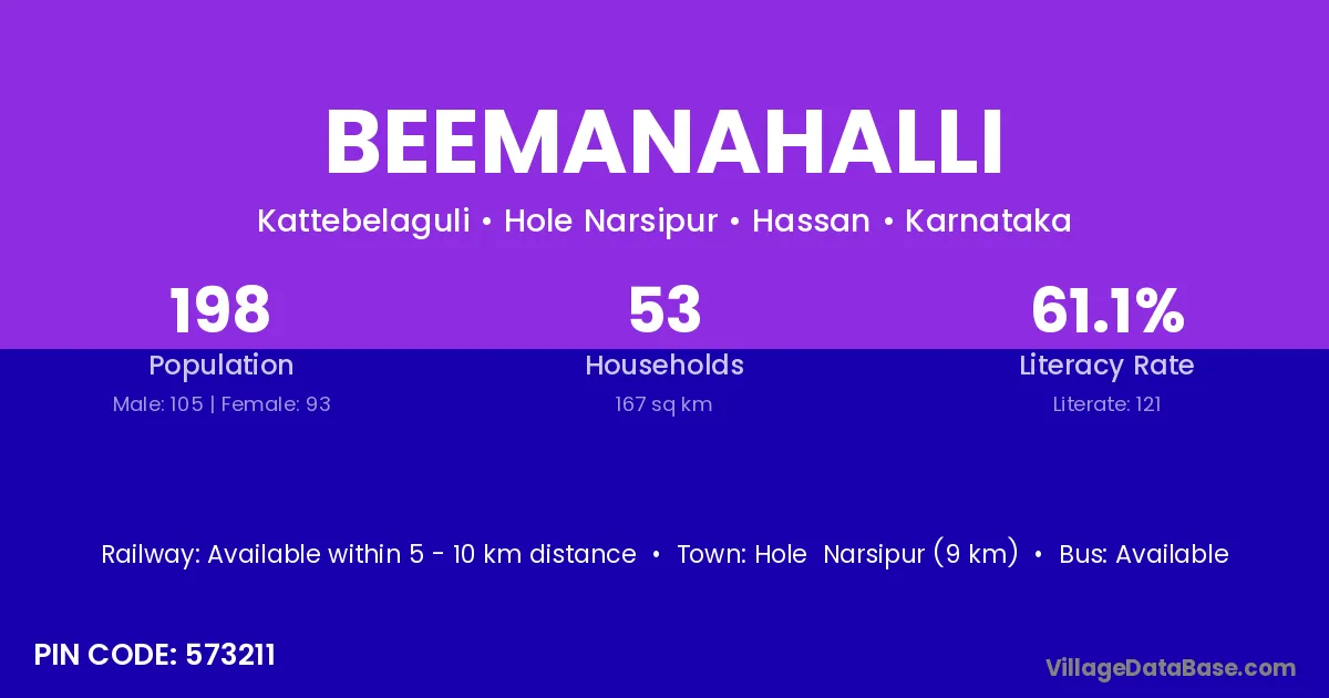 Beemanahalli village has a total population of 198 people, of which 105 are males and 93 are females.