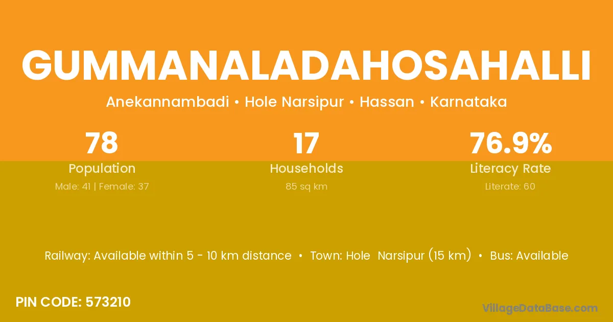 Gummanaladahosahalli village has a total population of 78 people, of which 41 are males and 37 are females.