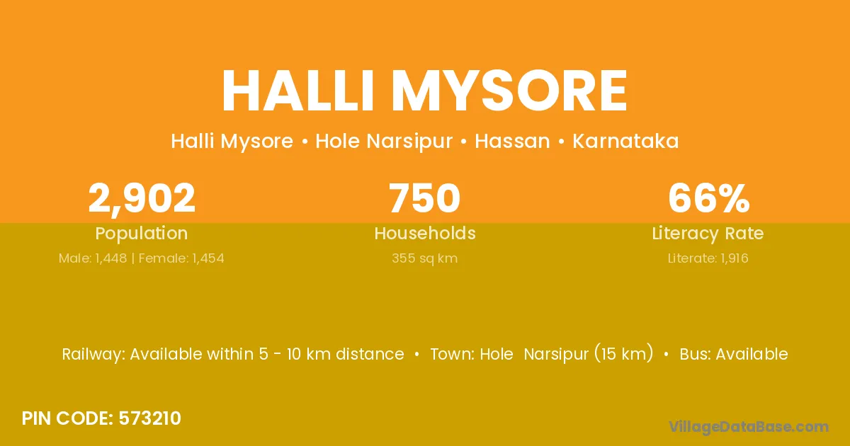 Halli Mysore village has a total population of 2,902 people, of which 1,448 are males and 1,454 are females.
