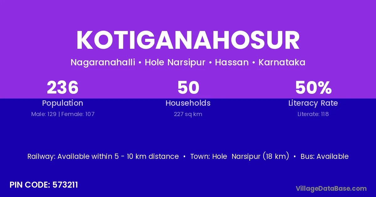 Hole Narsipur (18 km) is the nearest town to Kotiganahosur village for major economic activities and is located approximately 18 km away.