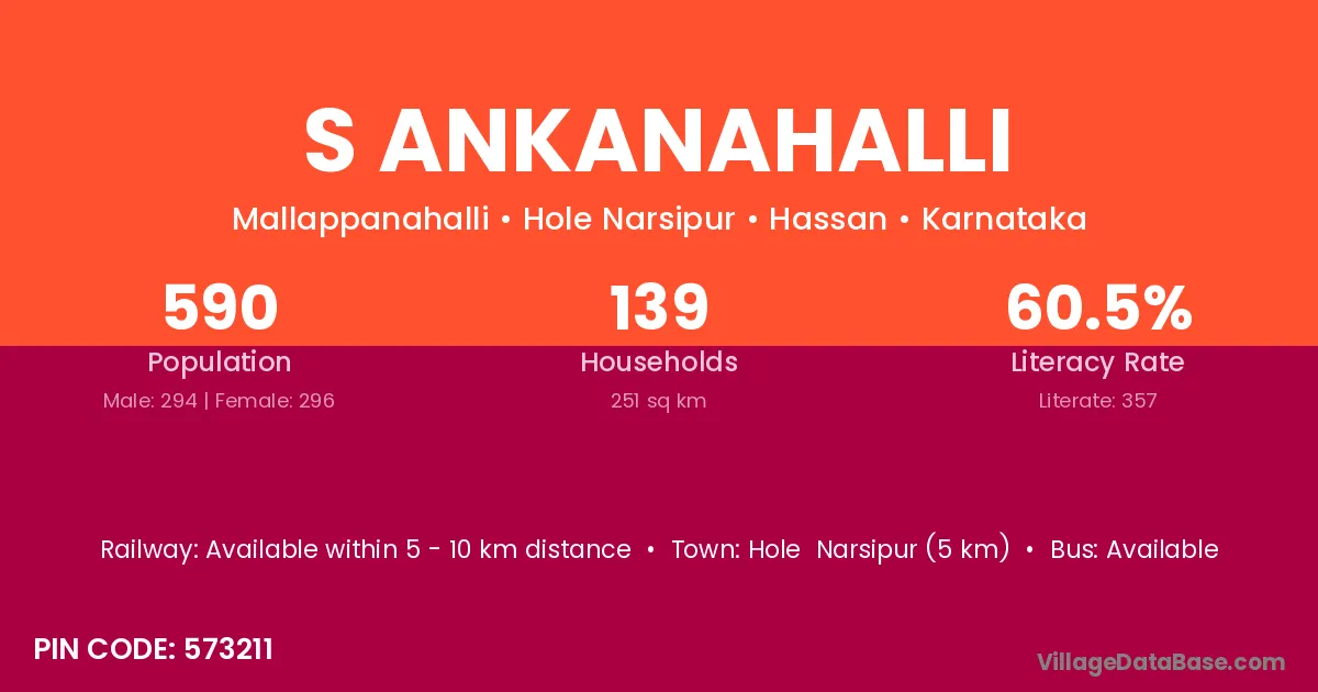Hole Narsipur (5 km) is the nearest town to S Ankanahalli village for major economic activities and is located approximately 5 km away.