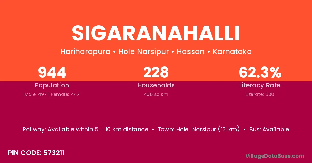 Sigaranahalli village has a total population of 944 people, of which 497 are males and 447 are females.