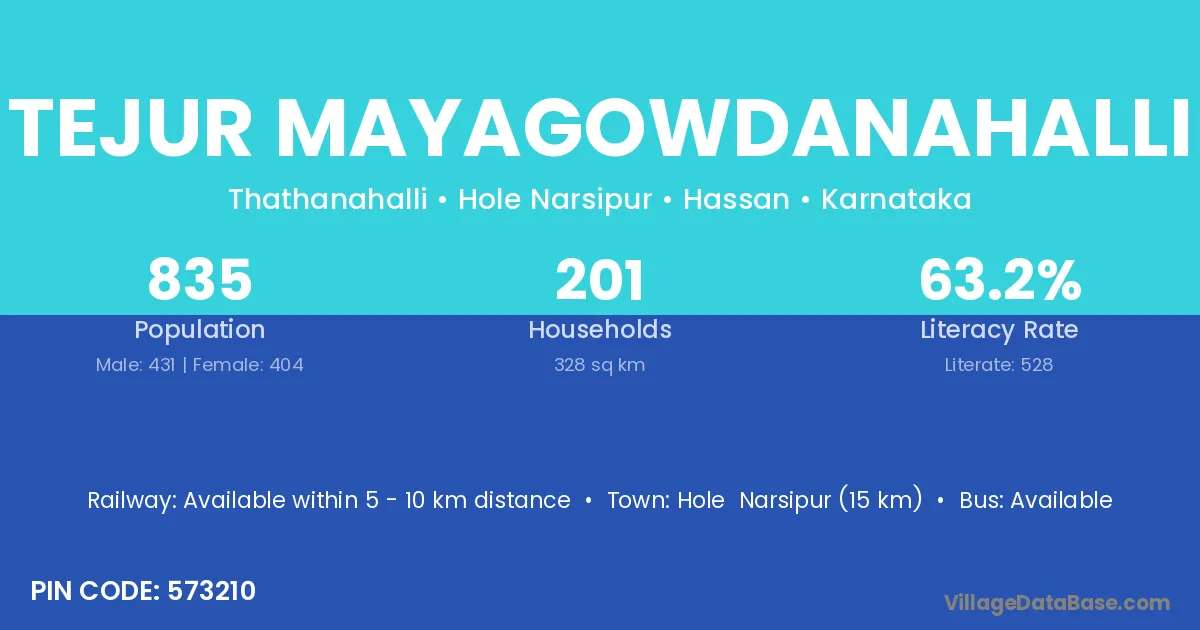 Hole Narsipur (15 km) is the nearest town to Tejur Mayagowdanahalli village for major economic activities and is located approximately 15 km away.