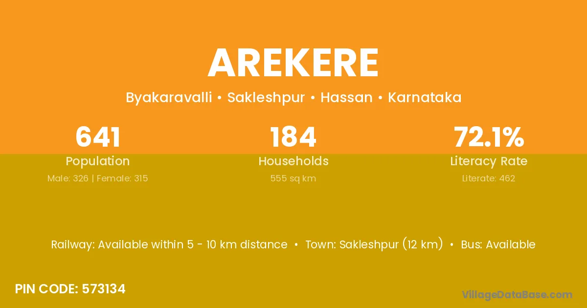 Sakleshpur (12 km) is the nearest town to Arekere village for major economic activities and is located approximately 12 km away.