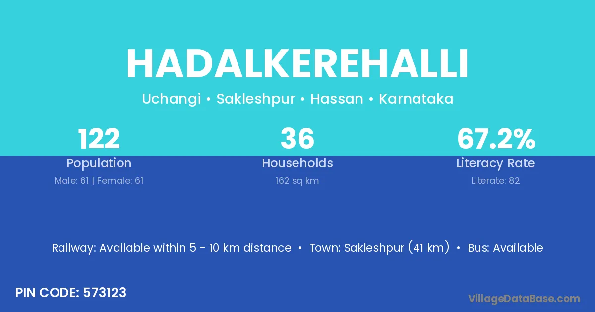 Hadalkerehalli village has a total population of 122 people, of which 61 are males and 61 are females.