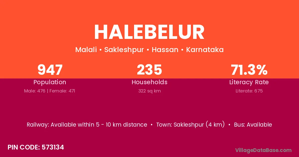 Halebelur village has a total population of 947 people, of which 476 are males and 471 are females.