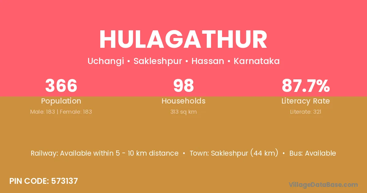 Sakleshpur (44 km) is the nearest town to Hulagathur village for major economic activities and is located approximately 44 km away.