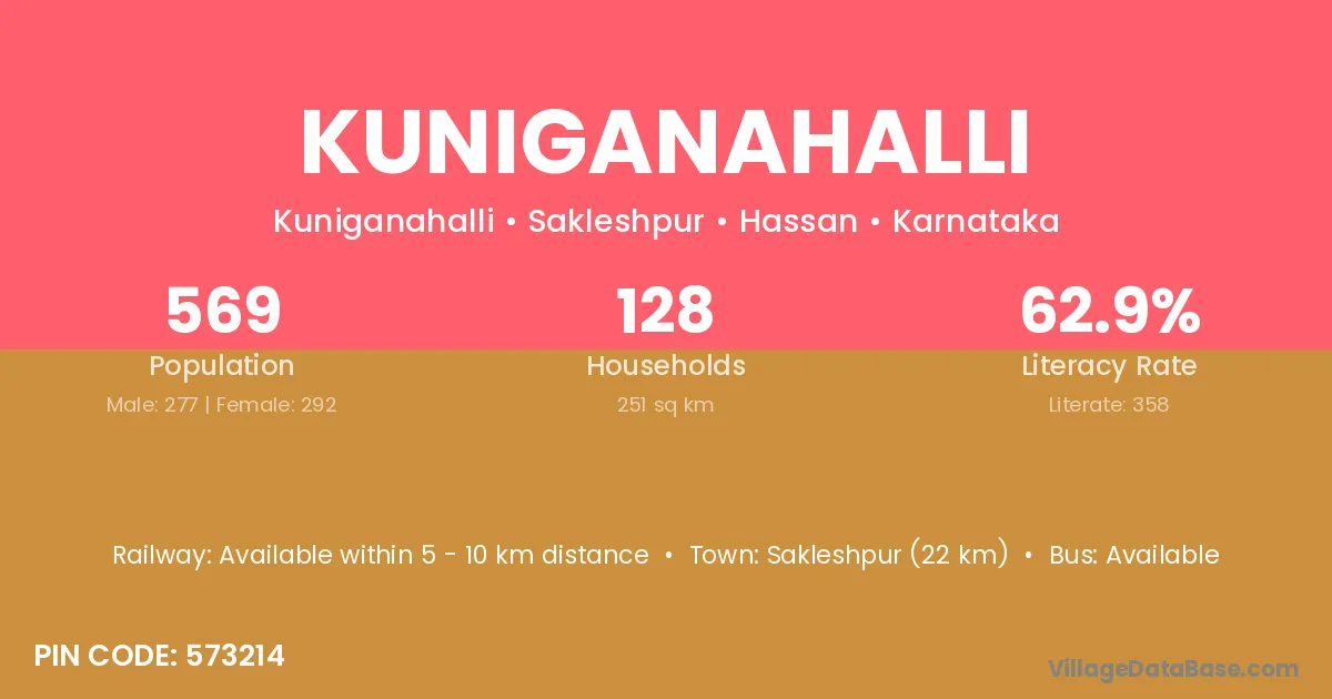 Sakleshpur (22 km) is the nearest town to Kuniganahalli village for major economic activities and is located approximately 22 km away.
