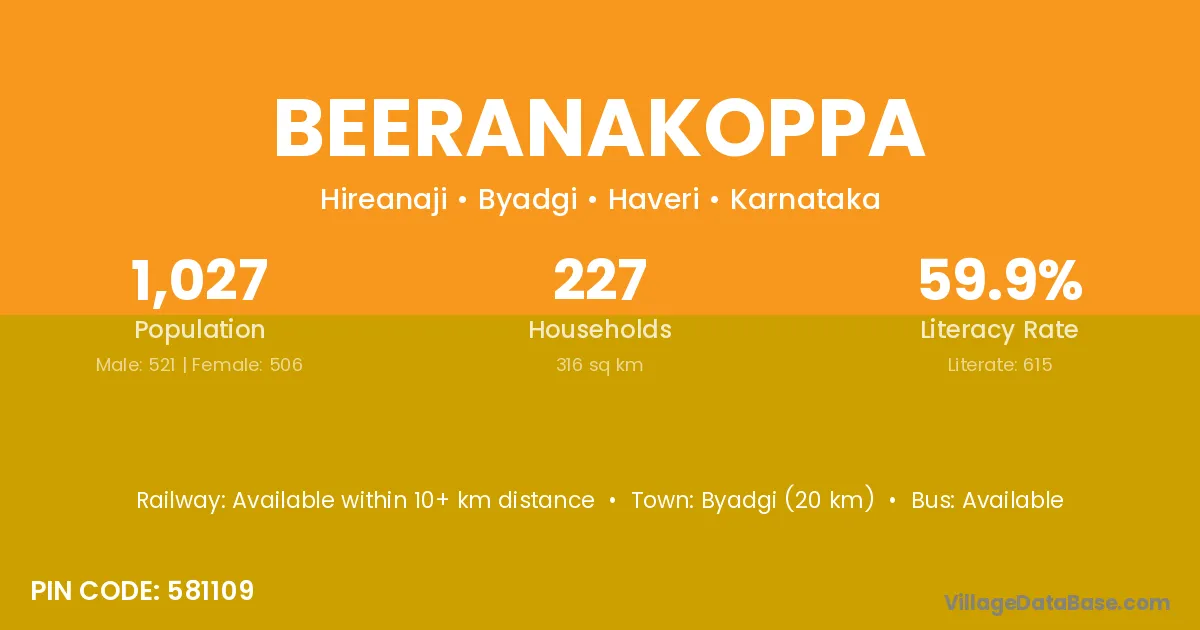 Beeranakoppa village has a total population of 1,027 people, of which 521 are males and 506 are females.