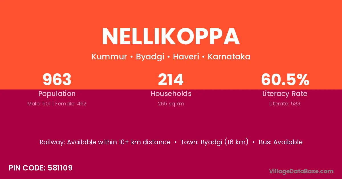 Nellikoppa village has a total population of 963 people, of which 501 are males and 462 are females.