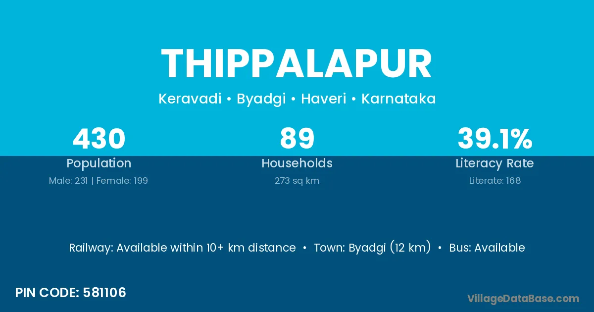 Byadgi (12 km) is the nearest town to Thippalapur village for major economic activities and is located approximately 12 km away.