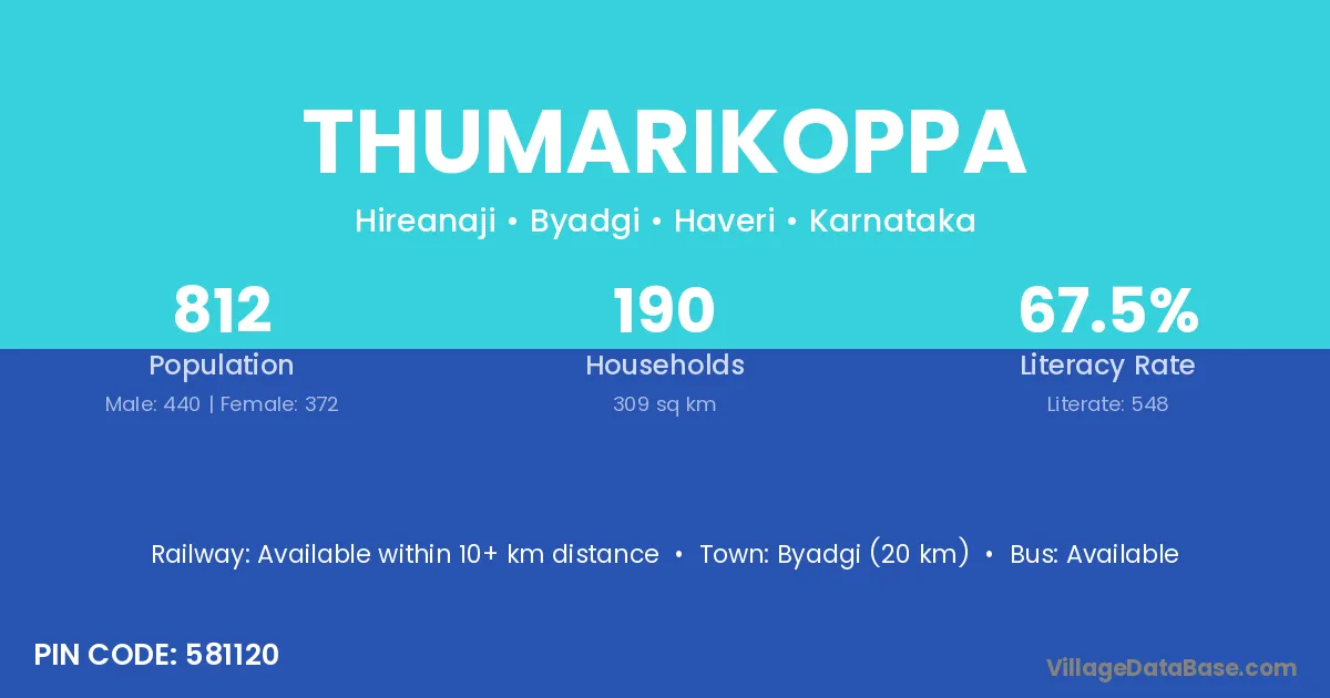 Byadgi (20 km) is the nearest town to Thumarikoppa village for major economic activities and is located approximately 20 km away.