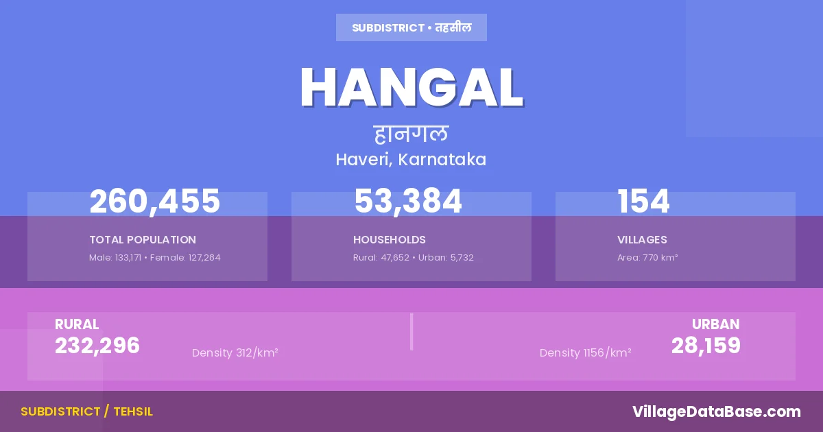 According to the 2011 census The total area of Hangal Taluka is 770 km², with a population of 260455 people. The population density is 338 inhabitants per square kilometre, and there are approximately 53384 houses in the sub district.