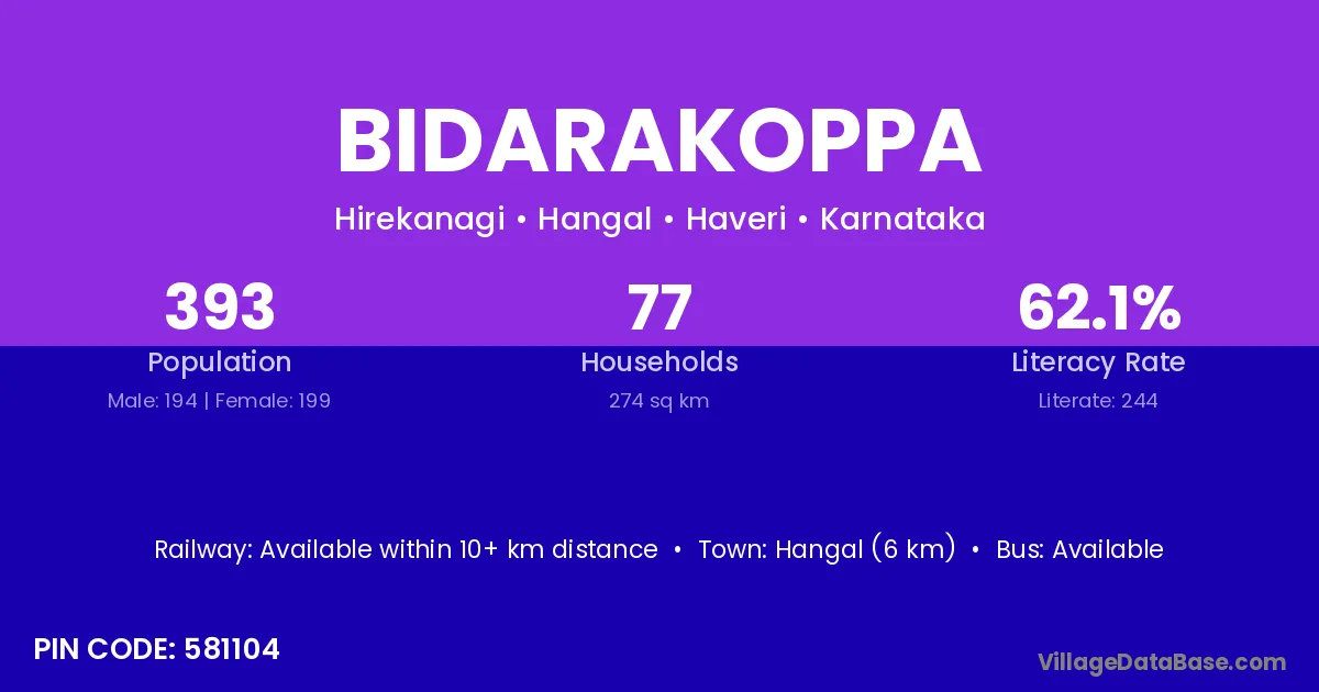 Hangal (6 km) is the nearest town to Bidarakoppa village for major economic activities and is located approximately 6 km away.