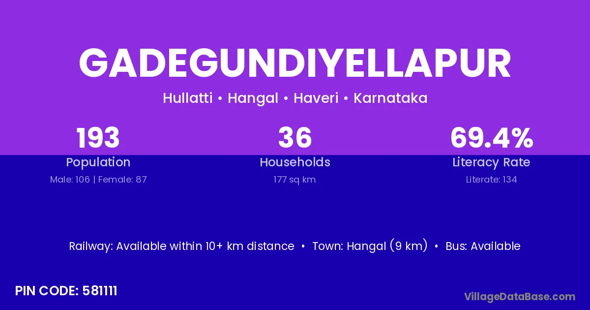 Hangal (9 km) is the nearest town to Gadegundiyellapur village for major economic activities and is located approximately 9 km away.