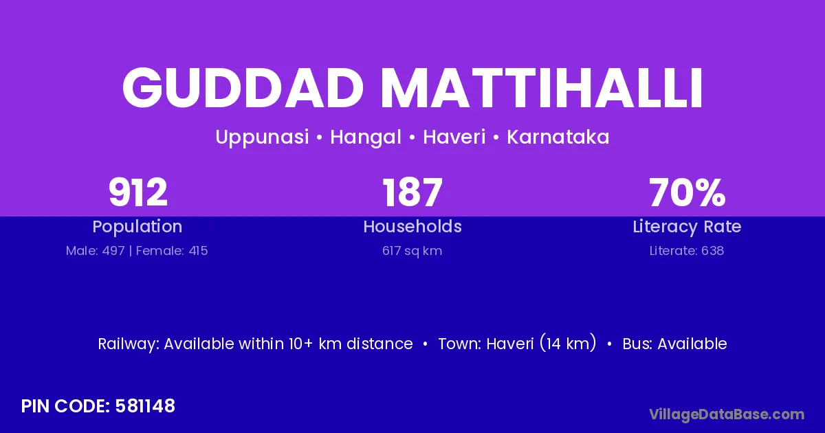 Haveri (14 km) is the nearest town to Guddad Mattihalli village for major economic activities and is located approximately 14 km away.