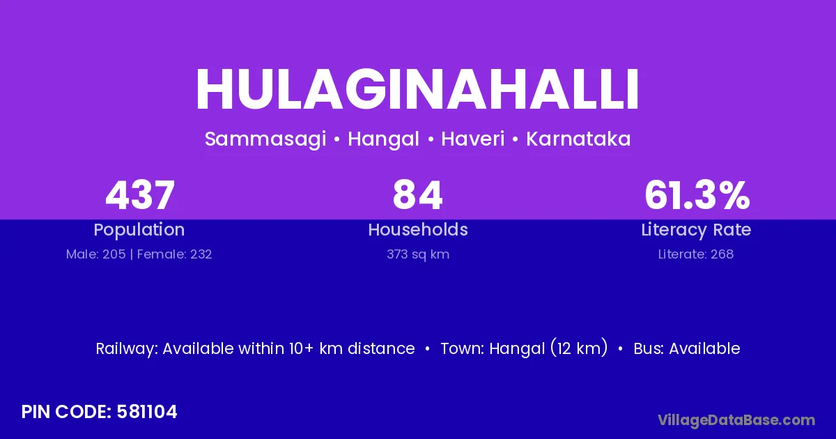 Hangal (12 km) is the nearest town to Hulaginahalli village for major economic activities and is located approximately 12 km away.
