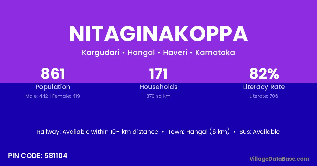 Hangal (6 km) is the nearest town to Nitaginakoppa village for major economic activities and is located approximately 6 km away.