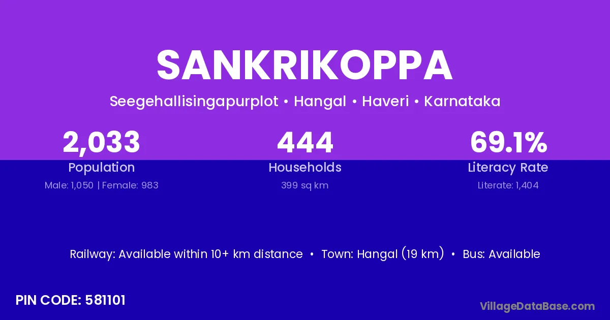 Hangal (19 km) is the nearest town to Sankrikoppa village for major economic activities and is located approximately 19 km away.