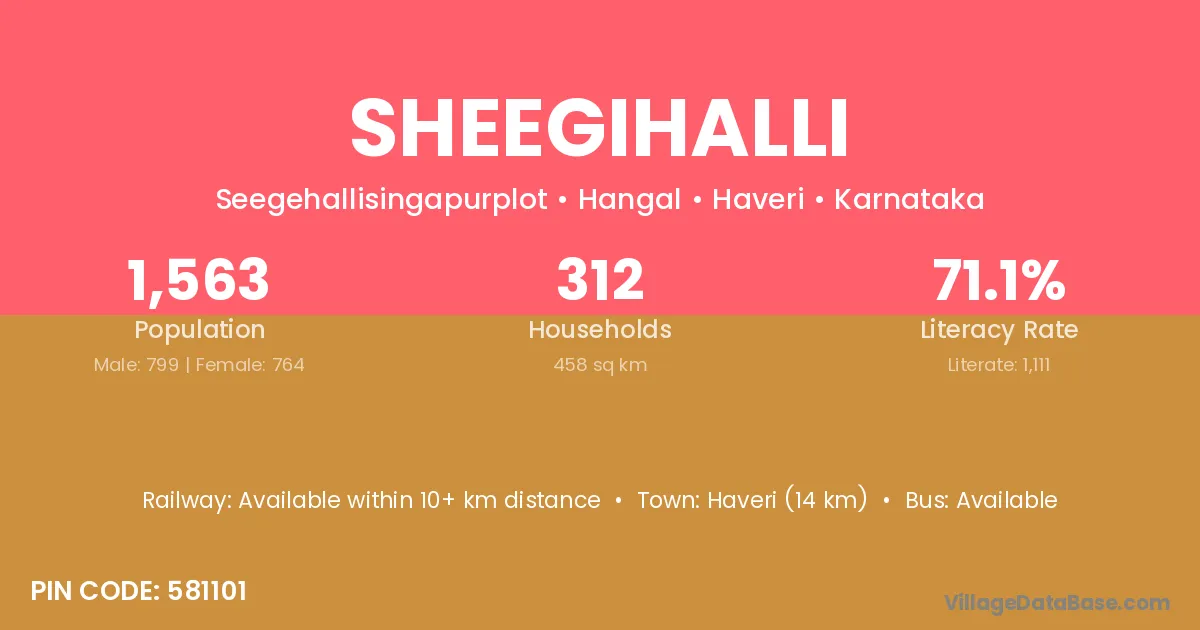 Haveri (14 km) is the nearest town to Sheegihalli village for major economic activities and is located approximately 14 km away.