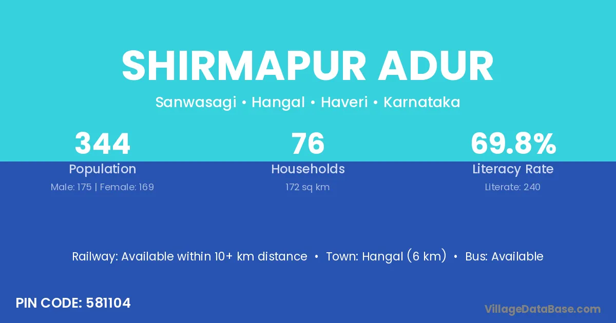 Hangal (6 km) is the nearest town to Shirmapur Adur village for major economic activities and is located approximately 6 km away.