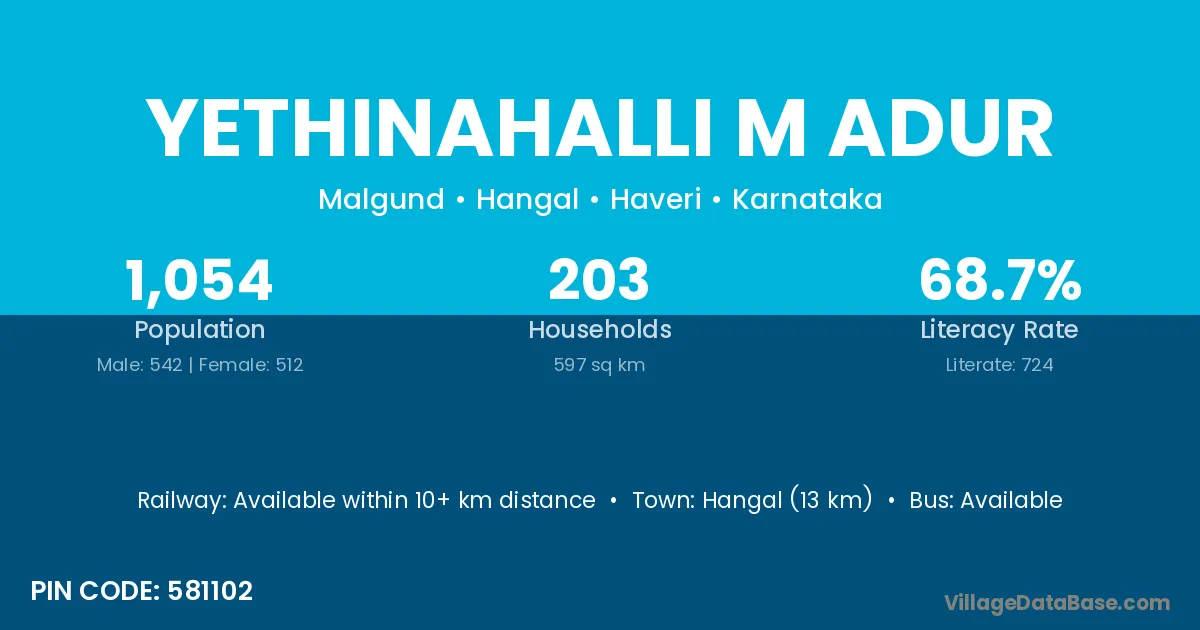 Hangal (13 km) is the nearest town to Yethinahalli M Adur village for major economic activities and is located approximately 13 km away.