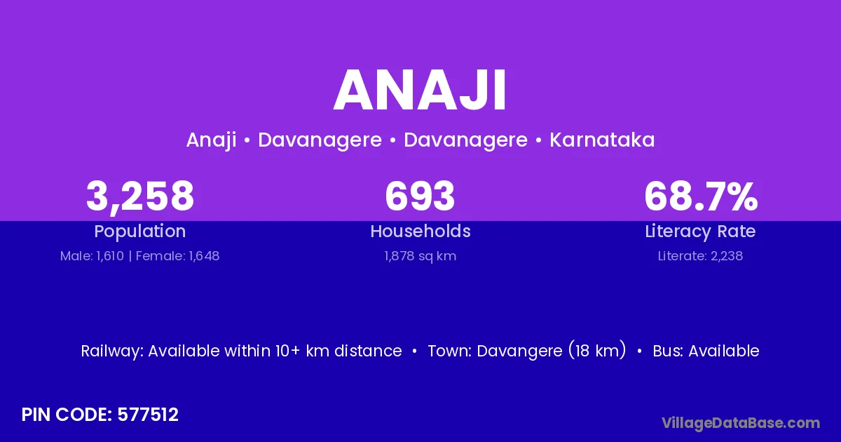 Hirekerur (25 km) is the nearest town to Anaji village for major economic activities and is located approximately 25 km away.
