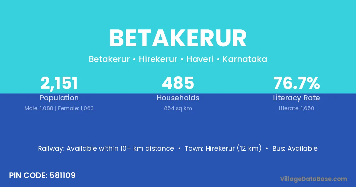 Hirekerur (12 km) is the nearest town to Betakerur village for major economic activities and is located approximately 12 km away.