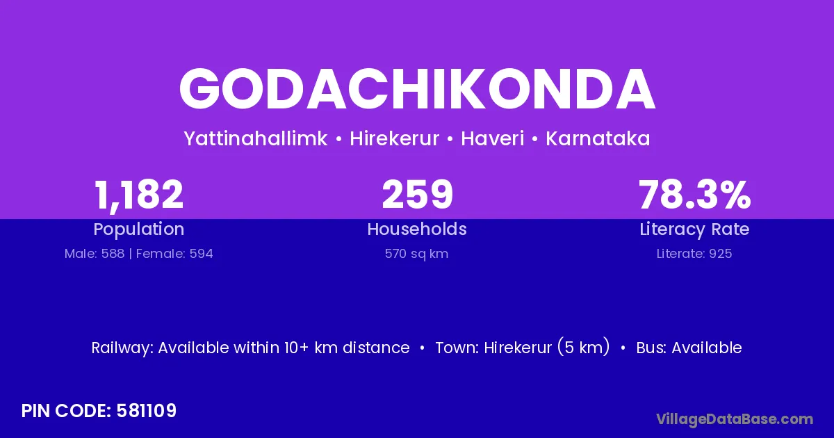 Hirekerur (5 km) is the nearest town to Godachikonda village for major economic activities and is located approximately 5 km away.