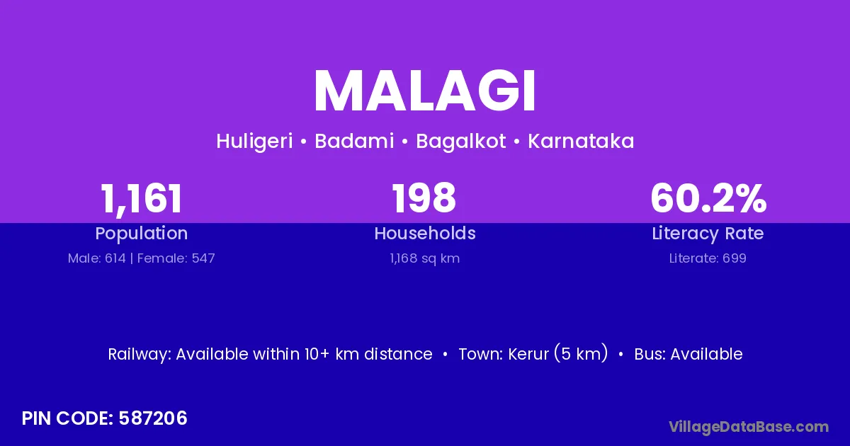Hirekerur (14 km) is the nearest town to Malagi village for major economic activities and is located approximately 14 km away.