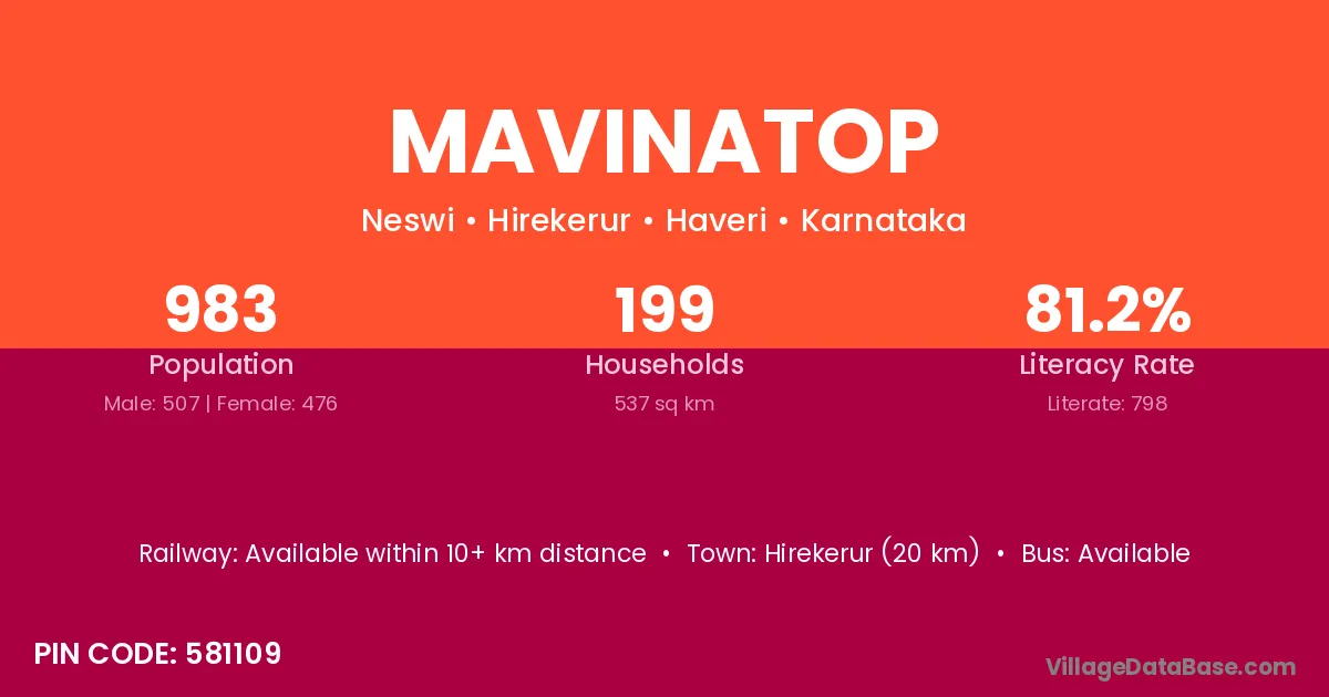 Hirekerur (20 km) is the nearest town to Mavinatop village for major economic activities and is located approximately 20 km away.