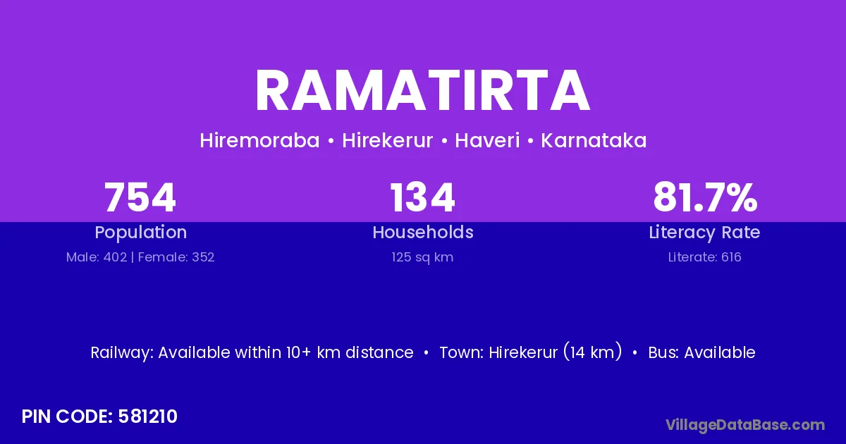 Hirekerur (14 km) is the nearest town to Ramatirta village for major economic activities and is located approximately 14 km away.